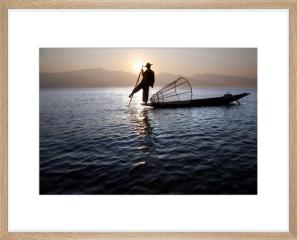 A fisherman showing off his age-old fishing technique at sunrise on Lake Inle, a freshwater lake located in the Shan Hills in Myanmar, creating a gorgeous backdrop for this quiet moment.