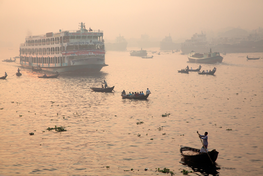 The golden shine coming through on the travel boats and little fishing barques alike, is due to the early sunrise glow on the bustling Buriganga river, flowing past the outskirts of Dhaka, the capital of Bangladesh.