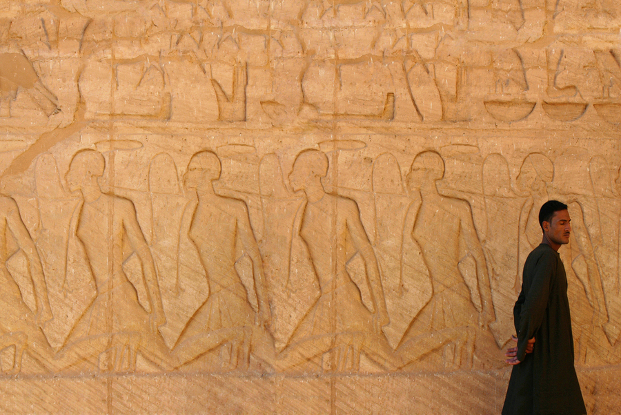 A young man is trudging next to the walls of the main entrance of one of the two grand rock temples of Abu Simbel in Nubia in southern Egypt.