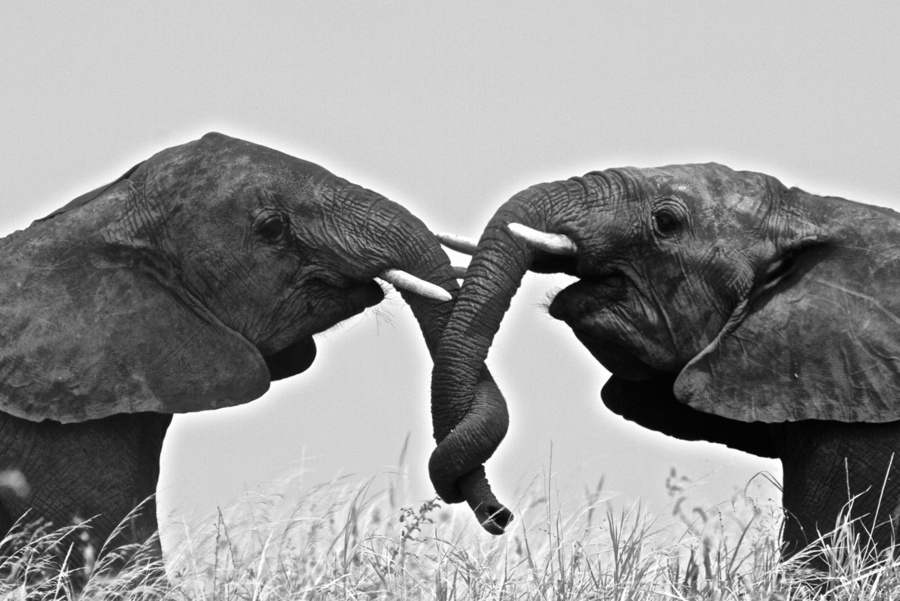 Two young cousins meet again - time for a hug "elephant style". Entangled, fraternal, interdependent in their force of life, majestic, and ferocious yet so tender.
