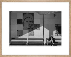 Taking a break from the procession, this nun has a solemn moment on a bench, posing next to a giant portrait of Bernadette; Marie-Bernarde Soubirous was the firstborn daughter of a miller from Lourdes and is venerated as a saint in the Catholic Church. The light that hits the patterned wall is a great addition to this interesting composition.