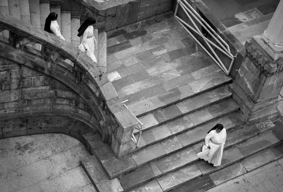Three nuns come down the stairs after a praying sessions at the Lourdes Basilica of Notre-Dame-de-l'Immaculée-Conception. The bright and light robes of the moving figures contrast beautifully with the hardened granite stones of the stairway, letting the architecture come alive.