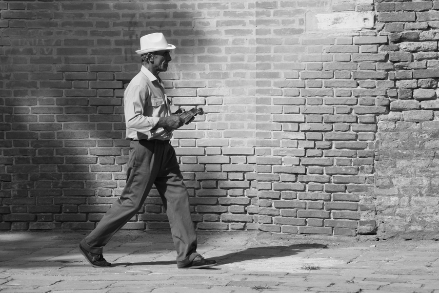 The decisive step that follows the pleasure of an accomplished performance. But where does it bring our musician to? And what does he carry in his violin heart? This street performer in Venice is a great study on movement and light, against a layered brick backdrop.