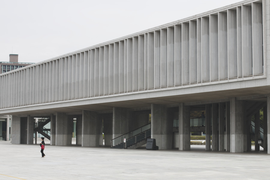 The Hiroshima Peace Memorial Museum, designed by famed Japanese architect Kenzō Tange, is a stellar concrete backdrop to this singular silhouette crossing the grey square. This image is a striking reminder of the very strength that can be associated to this incredibly solemn and dignified location.