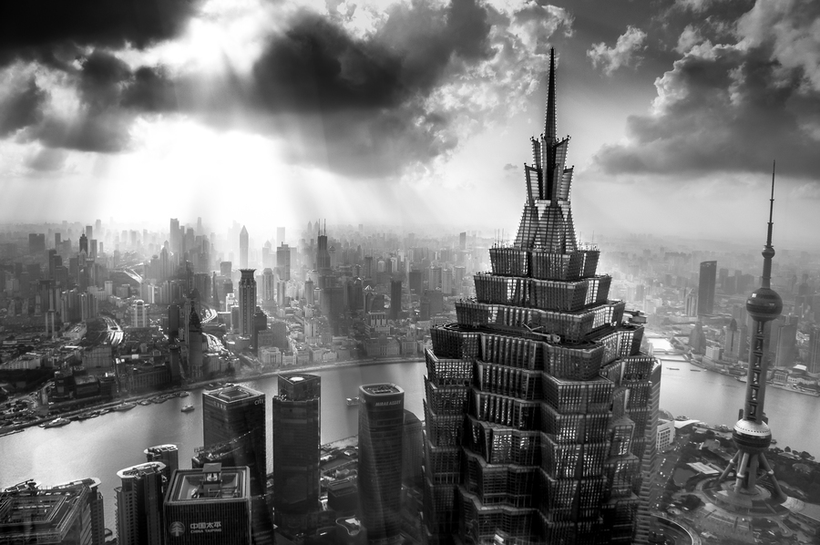 Shanghai is the most populous city center in the world, a global financial hub, has the busiest port and is an absolute concrete jungle. This image was taken from within the Shanghai World Financial Center, also known as “the Bottle Opener”. The main tower in this image is the Jin Mao Tower (also one of the tallest buildings in the world) and is about 421 meters high (and counting 88 floors).