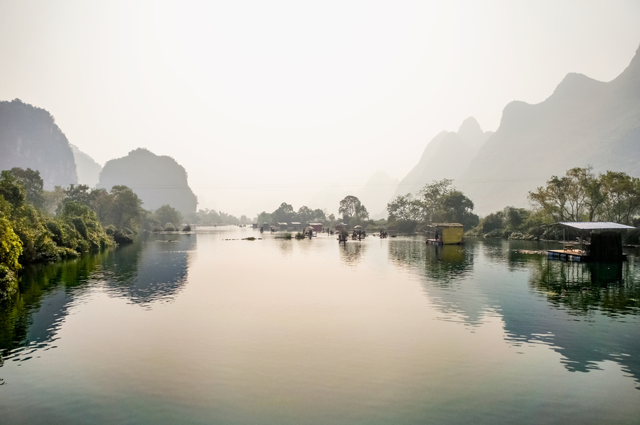 The Li River flows 83 kilometres from Guilin to Yangshuo in northern China. Especially towards the karst mountaintops around Yangshuo it is a vital part of the famous river sights associated with the area. This image has a quietly calming feel.