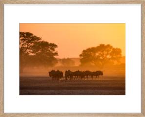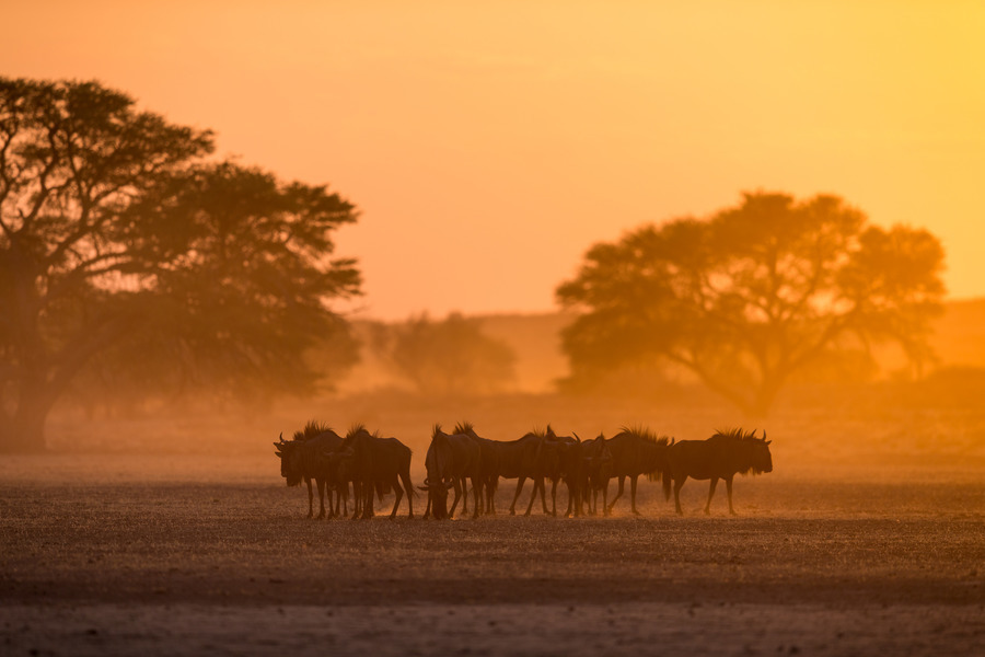 On an early morning in the Kgagaladi Transfrontier Park, on the border between South Africa and Botswana, a confusion of wildebeests crosses a dry river bed, leaving a trail of dust behind them.