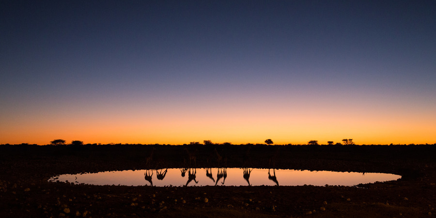 Time seems to stand still in this languid panoramic take of a tower of giraffes taking a moment to reflect (and be reflected) at their usual waterhole in Okaukuejo, near the Etosha National Park in northern Namibia.