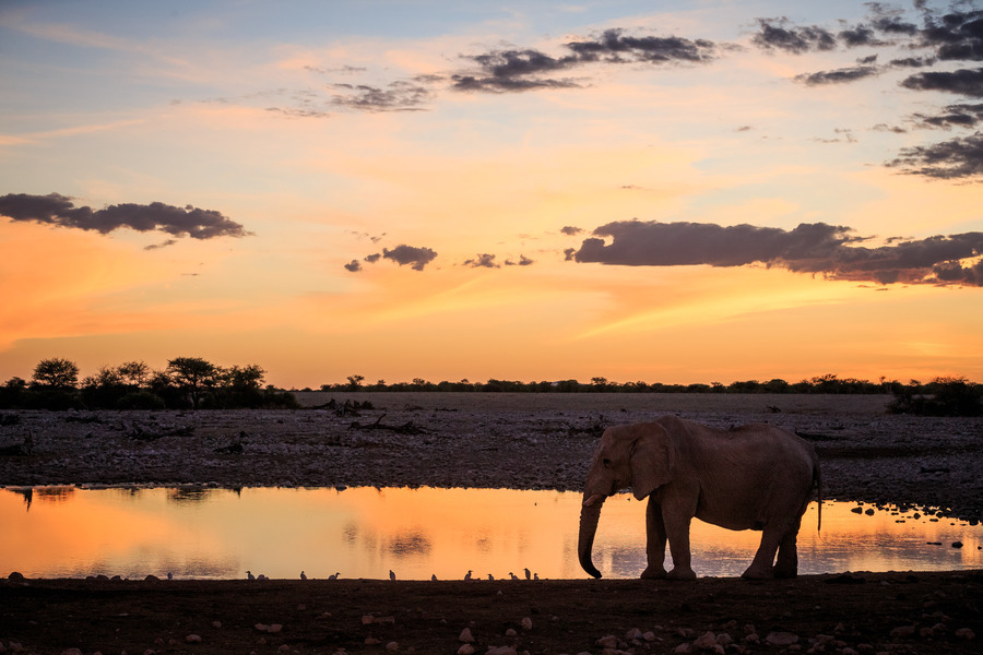 It is a veritable ritual: every evening, at sunset, when the sky turns to bright orange and gives us the most mesmerizing show on earth, this old elephant bull comes for a drink at the Okaukuejo waterhole in Etosha National Park. This once, we’re privileged enough to join him...