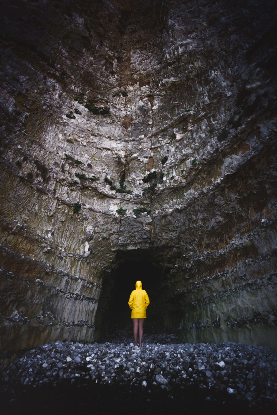 Seemingly lost in front of one of the many awe-inspiring caves along the beaches of Normandy, our protagonist cuts a dapper figure in her little yellow riding hood, as if at the start of her own fairytale, ready to enter and face the incertain future...